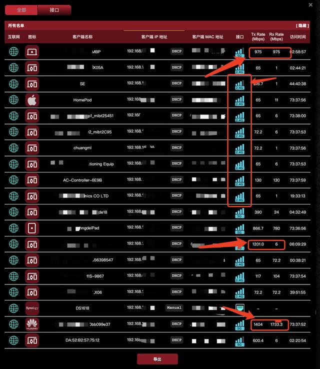 转到高级设置界面可以在网络地图中看到目前连接的设备情况,可以看到目前我家的ROG GT-AX6000目前连接了19个设备。其中大部分都是2.4G频段的智能家居产品,其余大部分连接到5G频段的设备基本也都开始支持Wi-Fi 6了。在阅览名单中可以查看设备的详细属性。