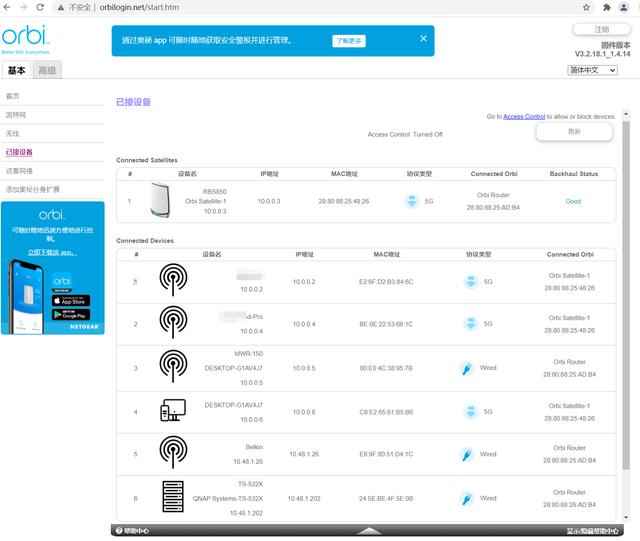 Orbi界面管理非常简洁, 就是对于路由器的接入网络, 路由器无线管理, 和连接设备的管理, 还有添加扩展等功能。 大部分Orbi的操作现在都集成到手机App中。