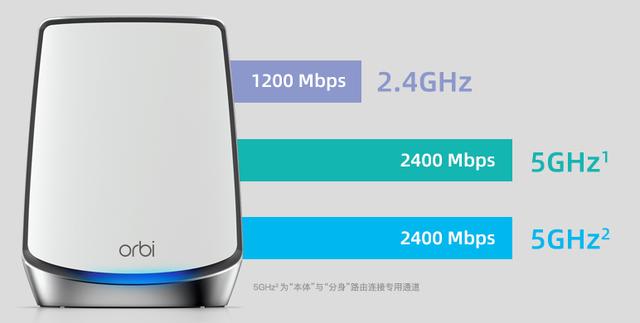 NETGEAR 网件orbi RBK852基于WiFi6技术, 提供了12个数据流, 速度最高可以达到6Gbps, 提供8个2.5Gbps互联网千兆端口, 而且具有端口聚合功能。 NETGEAR orbi RBK852的设置极其简单, 傻瓜式安装一插即用。 机器提供了一个频段2.4GHz有1200Mbps的速率, 两个5GHz提供2400MHz的速率, 而且5GHz提供的是双频,但有一个频段5GHz2是不能给用户直接使用的, 网件这个频段对于用户来说是隐藏的频段, 只能是路由器之间回程使用, 哪怕是有线回程, 这个频段也不能给用户使用。