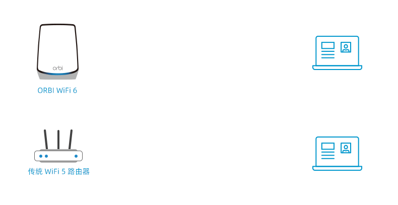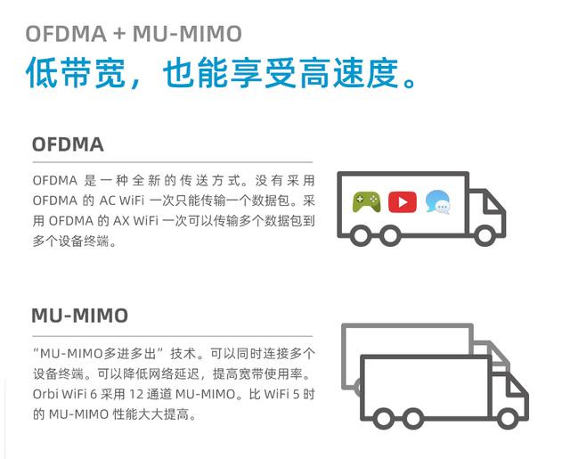WiFi 5在下行用了MU-MIMO技术,WiFi 6 支持完整版的MU-MIMO 技术,支持上下行,可以一次同时支撑更多的终端设备, 而且同时上行/下行能够传输更多数据。