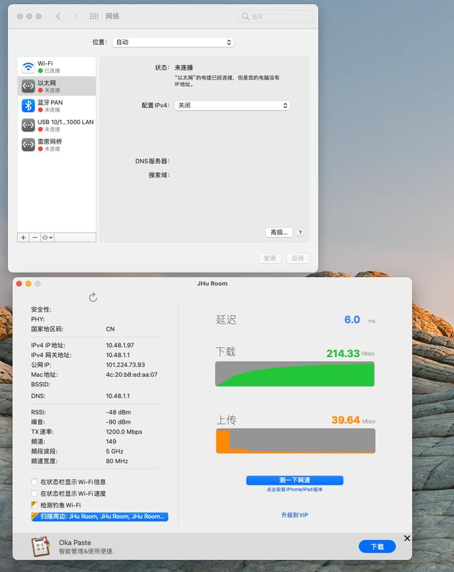 在Mac操作系统环境下,无线连接互联网网络测速, 200M的网速。