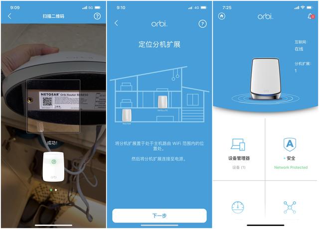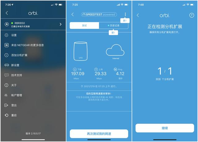 Orbi App初始化组网过程, 我其实想说几句。 Orbi是子母机器设置, 配置流程也不多, 也非常简单。但是这个过程我尝试下来不稳定, 会出现报错情况。 不清楚是不是我这个测试机的个例, 在初始化过程中我遇到了很多次报错, 和配网失败。那成功以后是下面这个样子。