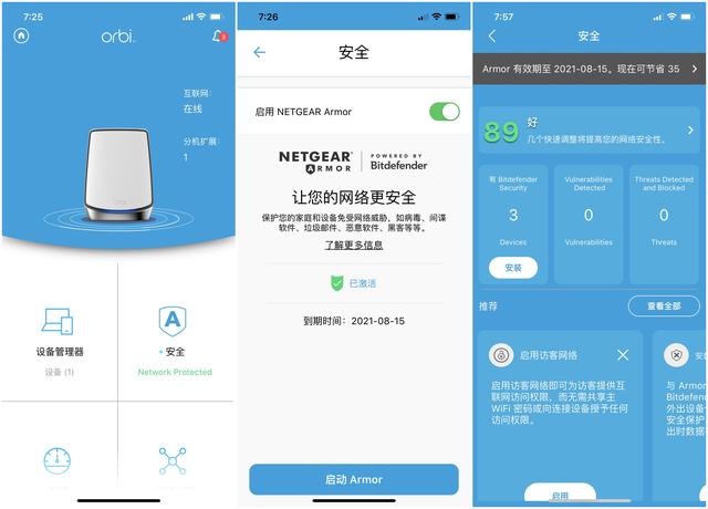 我开启了网件的Armor功能, 它能够扫描您的网络中的漏洞,检测可能带来安全风险的问题,例如固件过期或密码不足, 在路由器内部, 内建一个防病毒等一系列的防护服务。 还能够自动对于你的网络进行打分, 和应对建议。