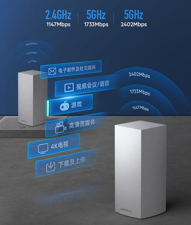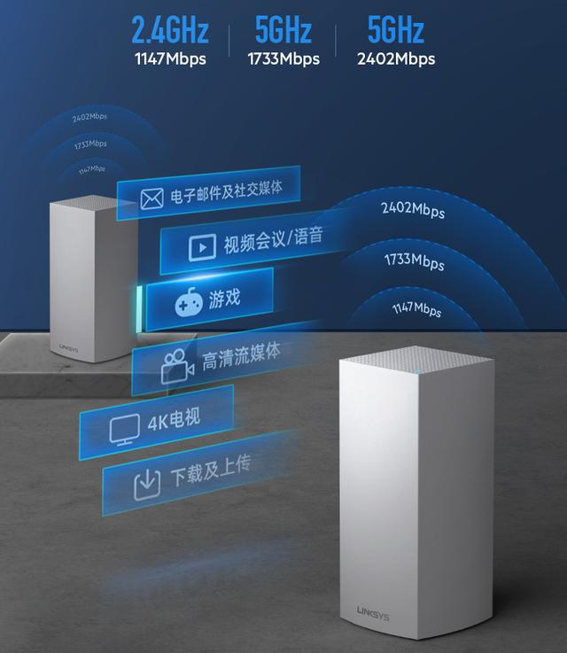 Linksys领势 VELOP MX10600和MX5300支持双频合一, 也就是2.4GHz和5GHz使用同一个SSID,而且5GHz下面还有两个频段, 这样实现设备无缝漫游, 而且连接稳定。时刻在线。