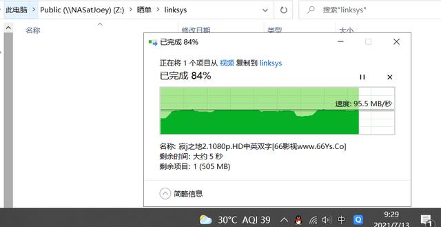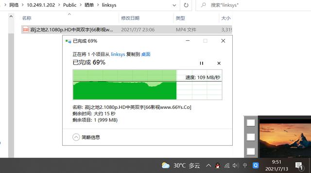 从电脑复制电影文件到NAS, 可以看到无线传输速度可以到千兆。