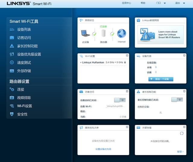 管理页面里面功能非常多, 可以实现对设备的控制, 访客客人的控制, 也有家长控制功能。 外部存储设备通过USB3.0接口接入以后, 也可以在这里管理, 实现简单的云存储功能。