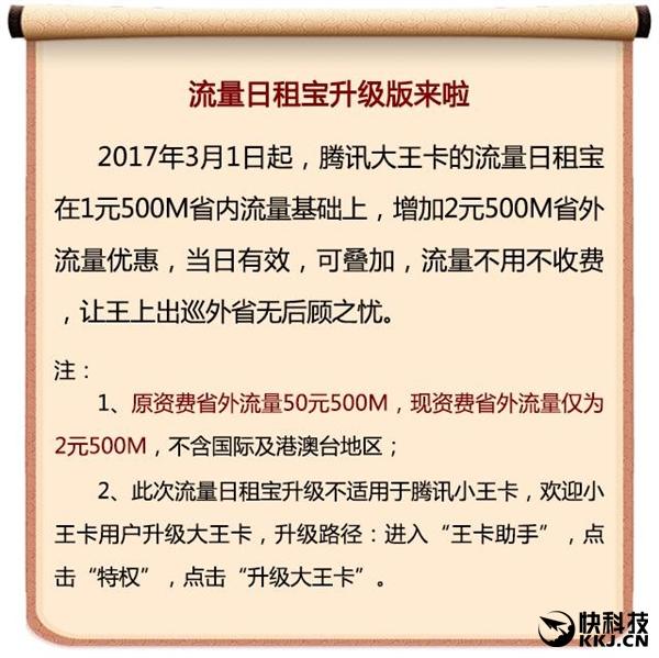 2017年3月1日起,腾讯大王卡的流量日租宝进行了升级,增加了省外流量,更加方便用户使用。