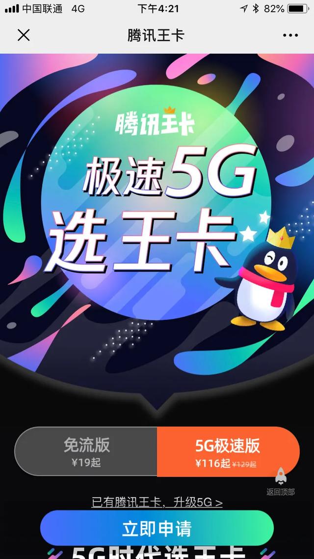 进入以后,开通的菜单里有一个申请王卡。选择5G极速版,点击申请。