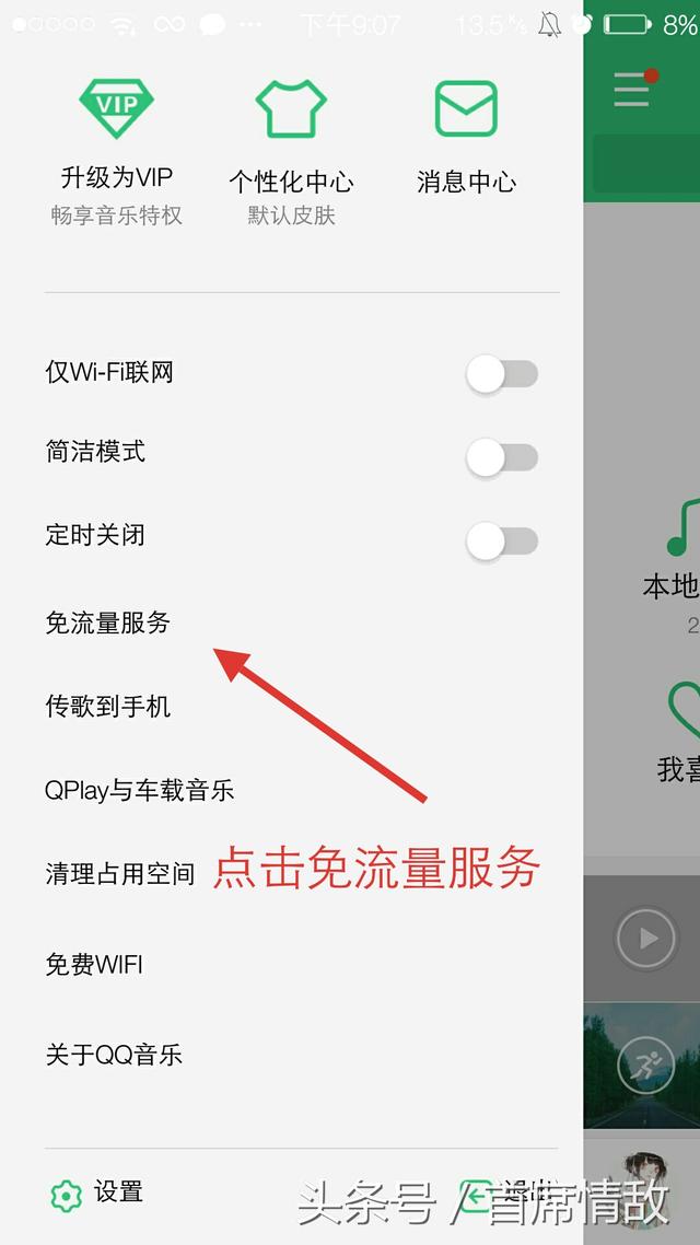 第一步,打开手机QQ音乐,没有安装的下载一下,打开QQ音乐后,进去菜单我们可以看到这里有一个免流量服务