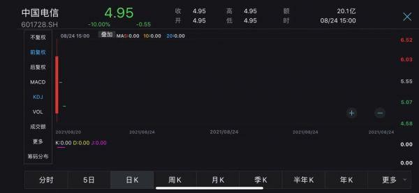 截至8月24日收盘,中国电信股价跌10%,报4.95元/股,总市值仍然高达4157亿元。如若明日中国电信继续遭遇跌停,跌停价将低于4.53元的发行价。另外,中国电信H股(00728.HK)在四连阴后,今日股价有所回调,报2.8港元/股,涨幅2.19%。