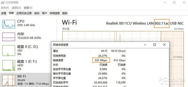 相比之下,无线网卡的判断更复杂一点,这里我们主要参考它的协议标准。通常市面上能够看到的无线网卡,只有802.11n、802.11ac、802.11ax三种,当然也有厂商简单称其为Wi-Fi 4(第4代)、Wi-Fi 5(第5代)、Wi-Fi 6(第6代)。想要达到千兆标准,最低也要达到802.11ac(Wi-Fi 5)这一级别。不过这里又开始和路由器有关系了,如果你的路由器不支持802.11ac同样也是白搭。而检查的方法,就是打开任务管理器,直接查看网卡名称中的协议标准。
