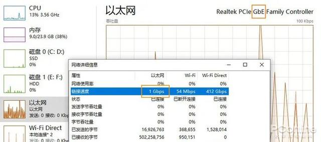 除了上面说到的这些内容外,网卡同样起着至关重要的作用。其中有线网卡最好判断,直接打开任务管理器,点击“以太网”,然后右击图形区中的“查看网络详细信息”即可。如果这里显示的是“1Gbps”链接速度,就代表你所用的是千兆卡。此外还可以观察网卡名称中是否包含了“GbE”字样,百兆卡通常会标明FE。