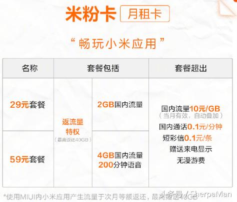 从官方消息中我们可以得知,小米这次推出的米粉卡有四种,分别为 1 元日租卡、3 元日租卡、29 元月租卡和 59 元月租卡。其中 1 日租卡基础租金 5 元,每用 500M 收租 1 元,全国通话 0.1 元每分钟,。