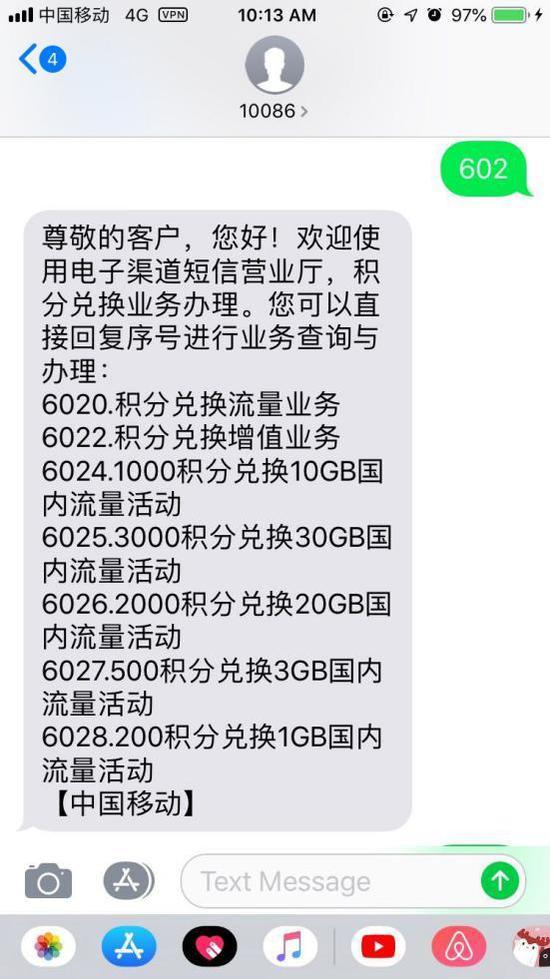 顾名思义,积分兑流量指用户可以利用所得积分免费兑换成流量。据了解,参与积分兑换活动的方法很简单,用户只需要编辑短信“602”发送至10086便可以详细了解参与活动具体信息。