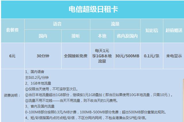 该活动推行时间为2017年3月3号至4月30号,该套餐月租仅需6元,享受全国免费接听,每天1元就能享受本地1GB的流量,该套餐对于流量需求一般而对月租较为看重的朋友是非常值得购买的。