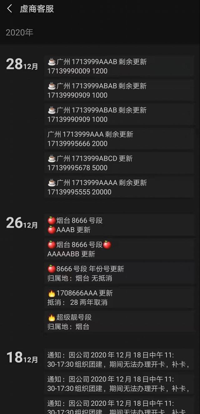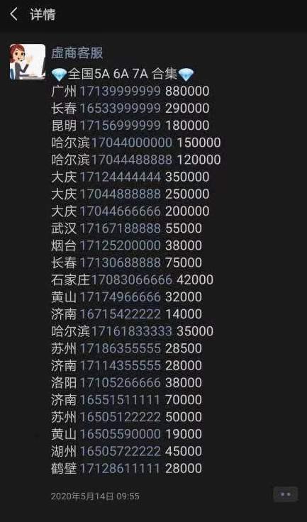 南都记者采访发现,目前很多虚拟运营商已经将C端号码交易业务转售给第三方,如亚飞讯。一位亚飞讯代理商告诉南都记者,他们目前代理业务的客户包括长城(鹏博士)、远特、蜗牛、苏宁、小米等虚拟运营商。该代理商在朋友圈中发布的靓号信息显示,不同等级的靓号,价格相差极大,从9.9元到880000元不等,等级越高的靓号,每月最低消费也水涨船高。