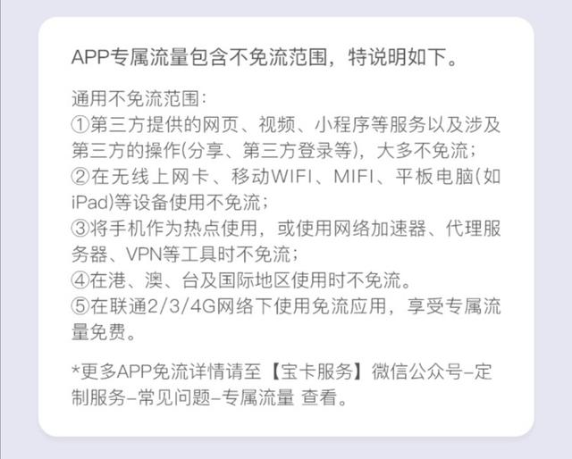 第一,这款套餐内是1个g通用流量,100分钟通话和40个g定向流量(流量超出后1元1g1天,定向流量超出后同理),可以免费添加5个联通号码为亲情号,拨打免费,具体免流软件和标准在下图。