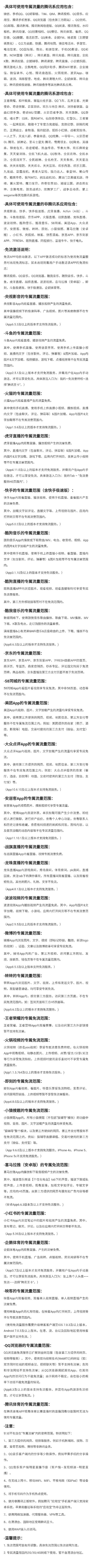 第二,他所包含的定向流量软件当中有微信、QQ这种常用的通讯软件,所有的免流软件和定向范围,全在下面的图片里。