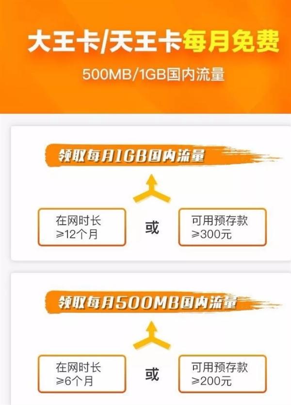 页面显示,在网时长超过12个月以上(含)或者预存款超过300元,可领取每月1GB全国流量。在网时长超过6个月(含)或预存款超过200元,可领取每月500MB全国流量。