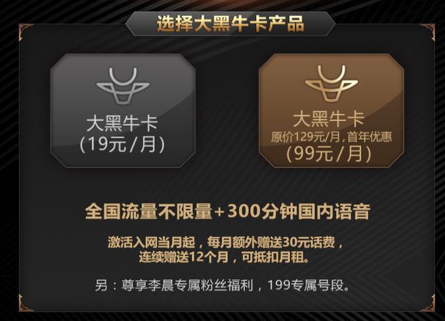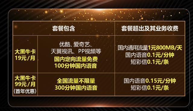 这款互联网套餐卡还是全国流量不限量的,对于流量不够用的用户可以说是很实惠的。大黑牛卡有19元月租和99元月租两款,19元大黑牛卡:优酷、爱奇艺、天翼视讯、PP视频等定向免流,超出后1元800MB一天,与腾讯大王卡类似;99元大黑牛卡:全国流量不限量。大家可以根据自己的需要来选择自己需要的套餐卡。