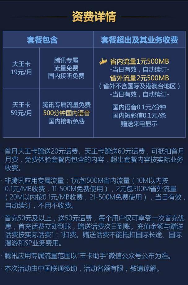 具体资费方面,腾讯大王卡省内流量 1 元 500 MB ,省外流量 2 元 500 MB ,当日有效,自动续订。但大王卡月租费仅 19 元,腾讯天王卡月租费升至 59 元。
