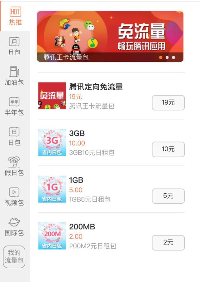 登录联通手机APP,进入流量包订购界面,可以看到联通热推的王卡流量包。