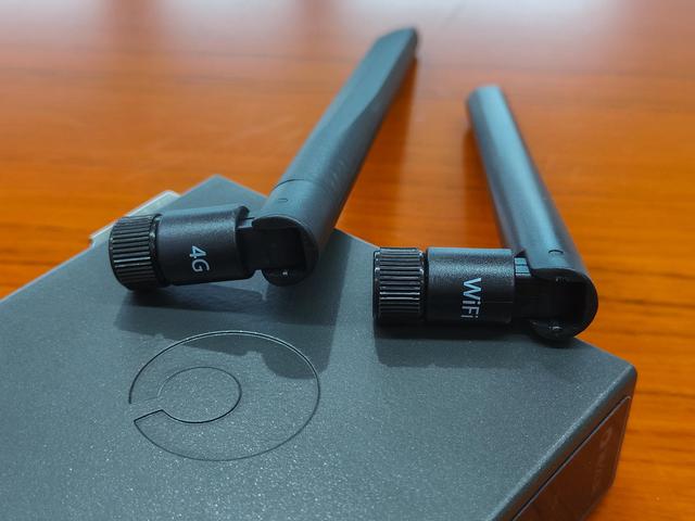 机器到手时,就已经标配了2根3dBi的360°高增益天线,而且2根天线分别因应4G和WiFi进行了信号优化,所以安装时,要根据天线上的标识提示来安装。