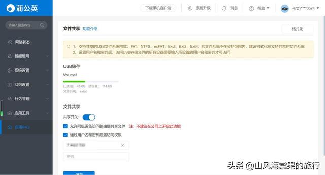 接下来是设置文件共享,可以实现组网内电脑、平板、手机的资料共享,如果不在局域网内,用户下载了APP也可以轻松访问,这样即使在外地出差也可以看到组网内的内容,非常方便。