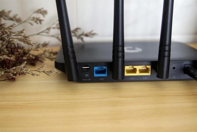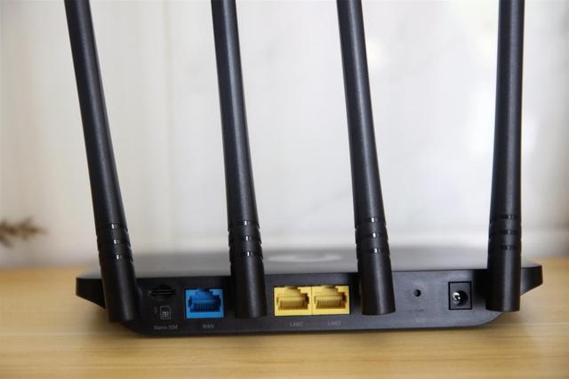 背面是这款路由器的电源插孔以及各种网孔,从左到右分别是SIM卡的卡槽、蓝色WAN口1个、2个百兆LAN口、rest重置按键以及12V的电源接口一个,虽然LAN口相对较少,但日常使用也足够,而且它更大的本事是组网和4G网络的转换覆盖,所以这点倒也不用介意。