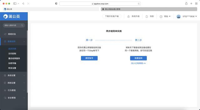 蒲公英的独有的异地组网功能是通过另一个后台来实现的,也是超赞的功能之一。配网比较简单,在蒲公英云管理器菜单里,第一步将你的蒲公英智能组网设备放在同一个Oray账号下,第二步进行组网,将智能设备组建在同一个网络下即可完成。