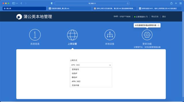 蒲公英路由器分两个后台,其中的一个后台蒲公英本地管理用来设置路由器网络连接,包括设置接入信号,WIFI相关设置等。抗干扰模式、均衡模式,穿墙模式、节能模式和标准模式等模式设置可以根据环境进行调整,还是比较实用的。