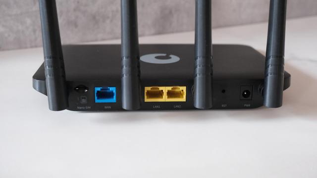 路由器背面的插口从左到右依次是SIM卡槽、10/100 Mbps自适应WAN口、2个10/100 Mbps自适应LAN口、重置按钮以及电源接口。现在的主要网络连接方式是无线WIFI,两个LAN口基本够用,我习惯一个接电视,一个接台式电脑,确保信号的稳定性。