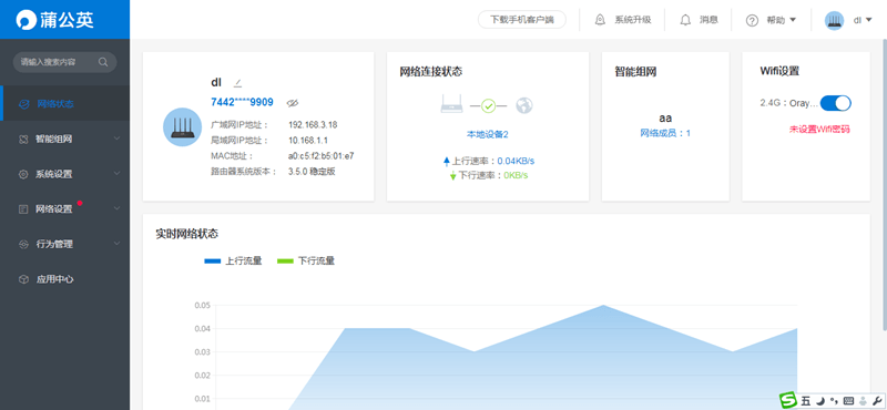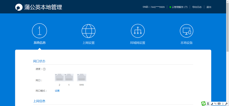 这里需要强调一点,蒲公英4G无线路由器有本地管理和远程管理两种方式,在登录界面会有对应选择,本地管理,主要是系统信息、上网设备、局域网设备和本地设备的管理。而远程管理的功能就比较丰富了,除了常规的网络状态、系统设置外,在这里还可以和其实设备进行智能组网等功能。