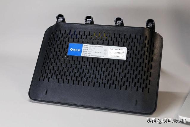 路由器的底部,除了产品标签外,还开了有大量的散热孔。透过散热孔,还可以隐约看到内部的黑色主板,一些芯片采用了金属屏蔽罩,可以防止信号干扰,提供更好的性能。