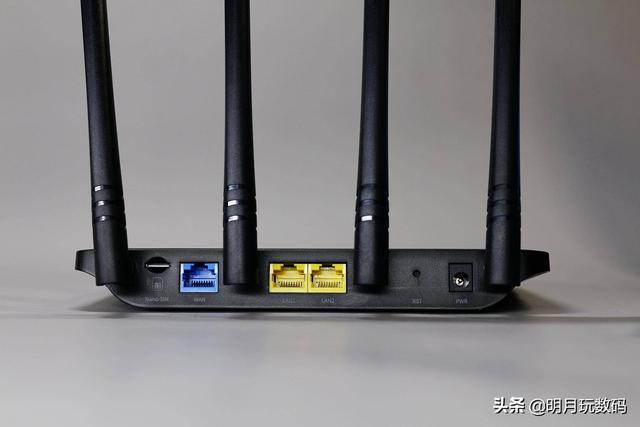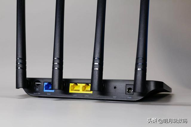 路由器的所有接口位于背面,从左至右分别是SIM卡槽、WAN口、2×LAN口、重置按钮和电源接口。路由器的WAN口和LAN口还采用了不同颜色区分,通过软件也可以定义接口功能。