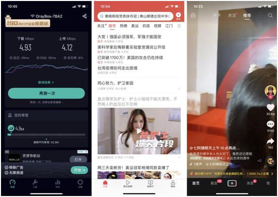 来测试一下使用蒲公英R300A连接4G网络的效果如何,我这边的设备都在地下一层,4G信号覆盖不是很好,苹果手机经常没有信号都。不过这款路由器的信号还不错,使用软件测试,下载速率为4.93Mbps左右,上传速率为4.12Mbps左右,刷抖音头条看视频缓冲很快,基本不用等待,稳定度不错。