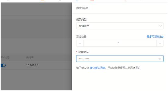 在成员类型处选择软件成员,然后选择添加的数量,然后设置登录的密码,需要注意的是,软件成员需要下载蒲公英APP才可以共享组网。