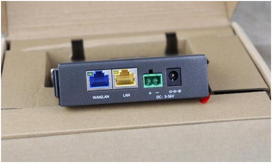 另外一侧,这里带有WAN/LAN接口,LAN接口,供电端口和电源接口,5~36V的宽压输入。