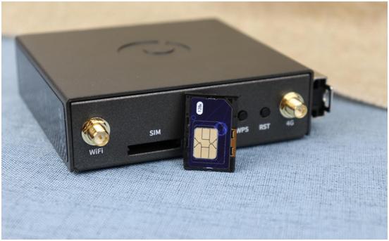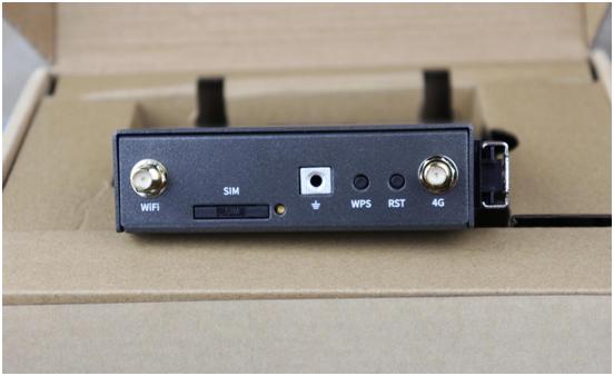顶部是WIFI和4G天线接口,中间是SIM卡卡槽,地线接口,WPS接口,RSYT接口。