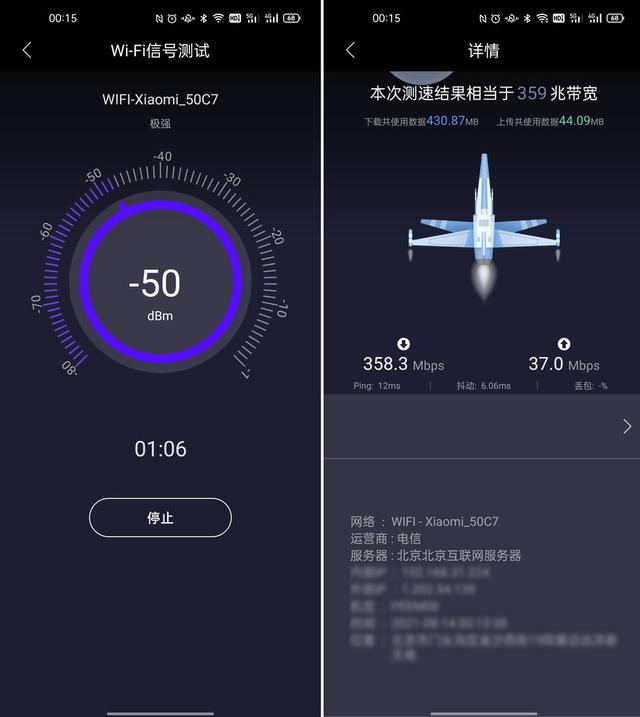 实际测试中,我们使用一款搭载高通骁龙888移动平台的安卓旗舰手机进行网络测试,目前家中的宽带为300M,根据网速测试软件最后测出来的结果显示,在小米路由器AX3000提供的5G WiFi6网络环境下,下载速度达到约360Mbpss,上传速度为约37Mbps,充分挖掘了带宽的极限。