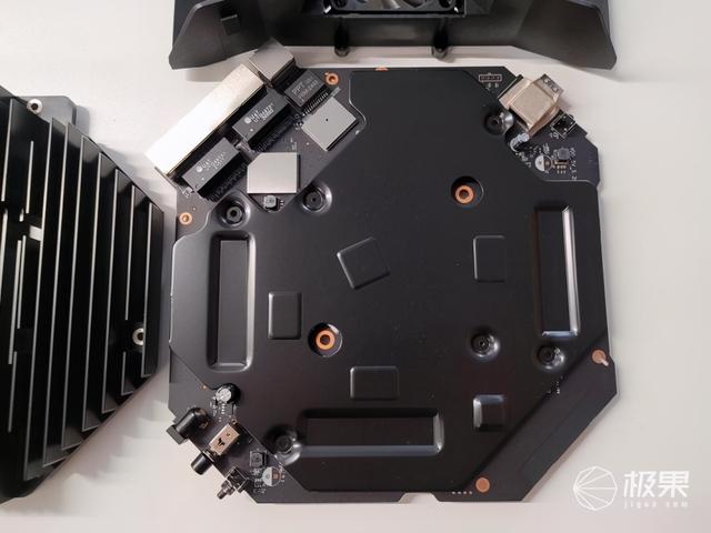 经过拆机发现,这款路由器的主板背部同样覆盖复合金属材料散热板,并且在路由器外壳底部和侧板均使用了镂空散热格栅设计。