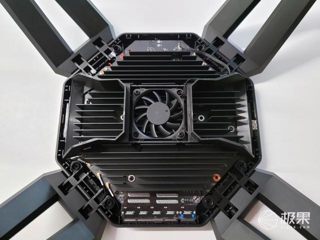 这款路由器主板上部的散热采用了复合金属材料散热鳍片设计,同时辅以低噪声静音风扇进行主动式散热,风扇转速可以根据整机发热情况自动调整。