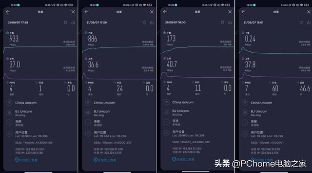 笔者对网络速度进行了测试,将小米路由器AX3000放在办公桌,使用手机连接上5G频段,笔者办公室使用的宽带约是千兆。距离路由器1米的位置下载速度为933Mbps,上传速度为37Mbps;距离路由器5米的位置下载速度为886Mbps,上传速度为36.6Mbps;距离路由器7米隔墙的位置下载速度为173Mbps,上传速度为40.7Mbps;距离路由器9米隔墙的位置下载速度为0.24Mbps,上传速度为37.8Mbps。
