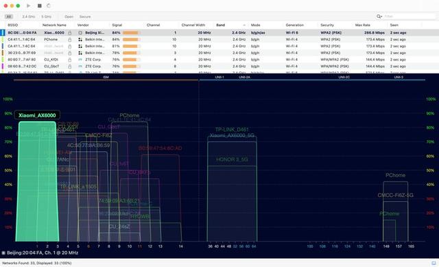 在实际体验下来看,小米路由器AX6000的信号覆盖能力还是不错的,房间的每一个角落都可以搜索到信号。在距离小米AX6000很近的位置测试信号的时候,小米路由器AX6000的信号还是很强的,强于屋内其他的路由器。在距离路由器5米隔门的位置测试时,虽然信号有所衰减,但是依然强于屋内其他路由器。在距离路由器6米隔墙的位置测试信号时,小米路由器AX6000的信号有更多的衰减,但是还是很稳定的。(由于笔者在这个距离测试信号强度时,当时的房间里有其他的路由器,所以会出现一些路由器信号高于AX6000的情况)。
