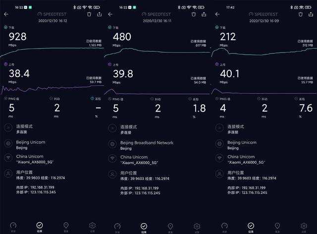 可以看到在小米路由器AX6000周围测试的时候,速率还是很强的,下载速率达到了900多Mbps,基本可以跑满速率。在经历了门以及墙的阻拦以后,速率有所下降,但是依旧可以达到200多Mbps,足够满足用户的日常使用,带来高速的上网体验。