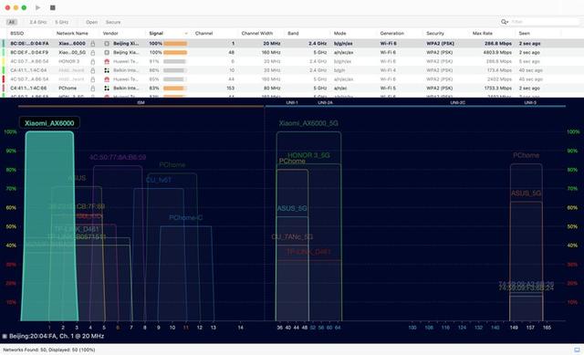 不仅仅是压缩数据密度,小米路由器AX6000还拓宽了频宽,目前很多WiFi6路由器的频宽都是WiFi6 4×4 80MHz。小米路由器AX6000搭载的Wi-Fi6增强版技术支持4×4 160MHz高频宽,频宽扩宽了一倍,不仅可以提升速度,还能减少多设备连接时候的拥堵,提升上网体验。值得注意的是,需要配合支持160MHz的设备使用。