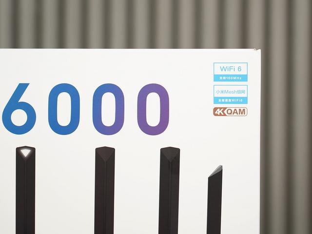小米路由器AX6000的外包装盒上除了印有路由器的外观图以及名称之外,还在右上角印有160MHz高频宽、小米Mesh组网以及4K QAM等技术配置。