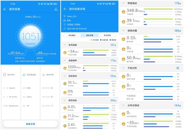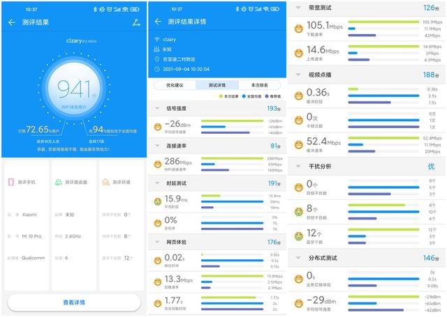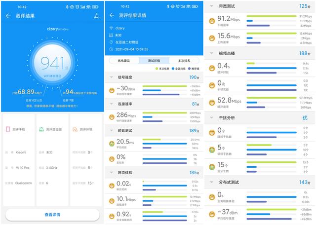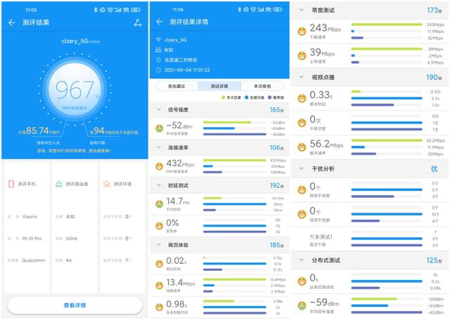 我的测试很简单,就是使用WiFi评测大师APP,在小米10 Pro上进行测试,直接看最终的数据。我选择了在客厅(路由器所在位置)和三个房间(隔了不同数量的墙)分别连接2.4GHz和5GHz进行测试。 首先来看下2.4GHz下的表现。测试点1也就是客厅的位置,不管是信号强度还是延时效果都还是不错的,不论是网页还是视频毫无卡顿,评分和排名都不错。毕竟路由器就在这里,问题不大。