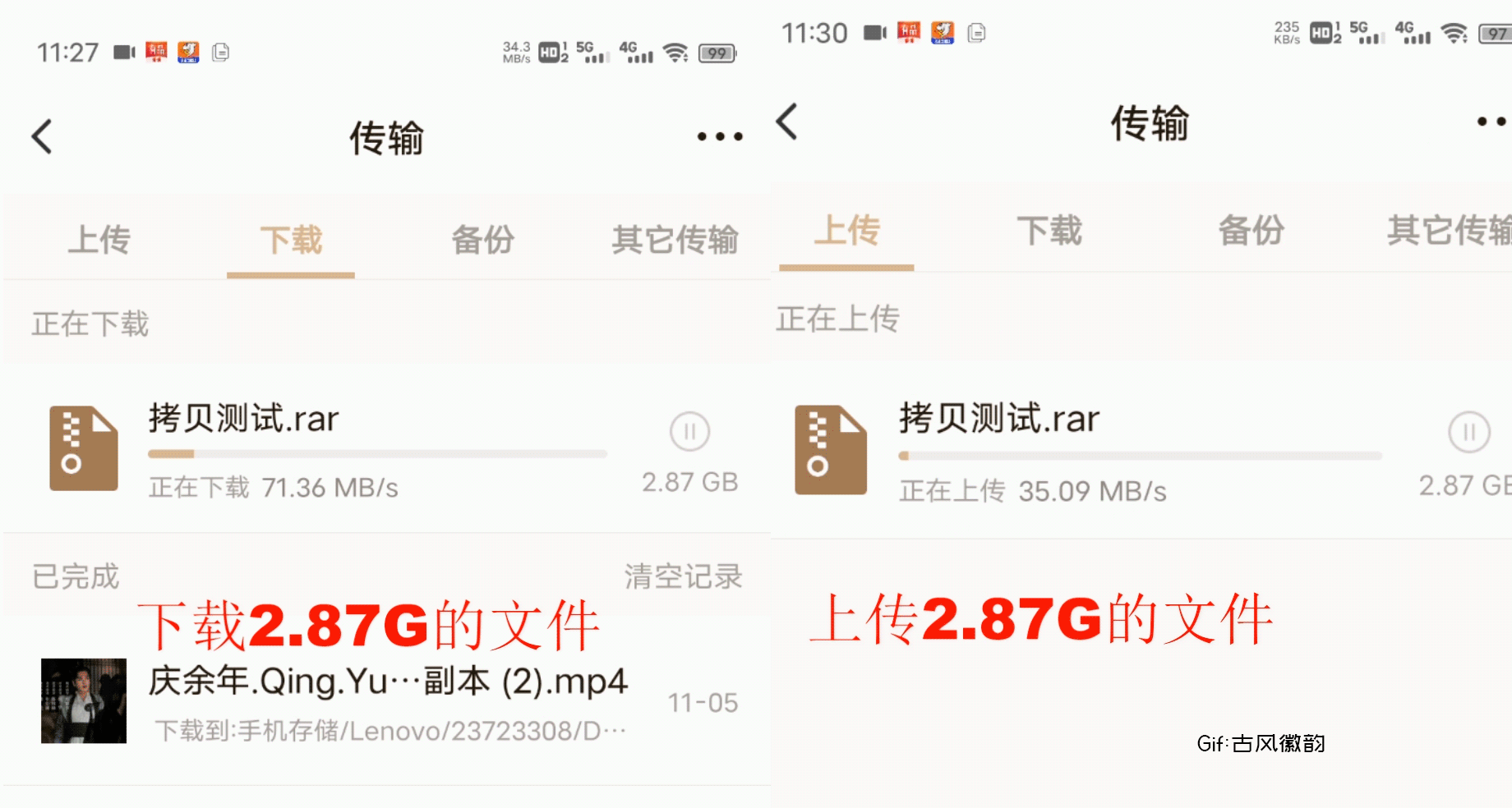 接下来,通过手机测试了一下联想个人云A1的上传下载速度,同样为2.87G大小的文件从个人云A1下载到手机,32 秒左右传输完毕,速度最高峰值达到102MB/s,平均90MB/s左右;而上传方面,2.87G的文件传到联想个人云A1,用时83秒左右,平均速度34.5左右!