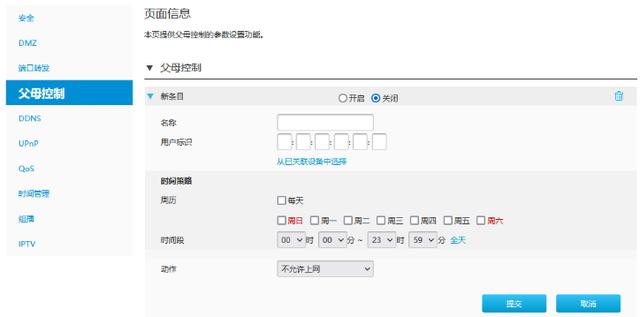高级设置里面的功能就更多了,除了一些专业的功能之外,还可以设置父母控制,开启或关闭或限制路由器的上网功能,这对于家里有小孩的用户来说,能够避免孩子在学习的时间上网。